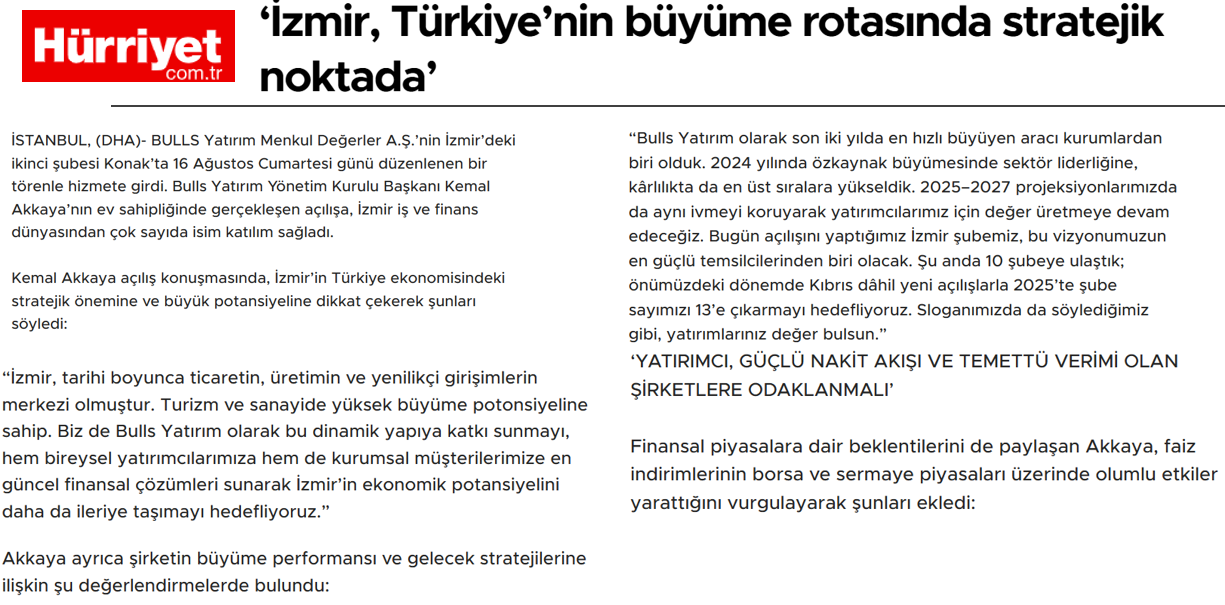 BULLS Yatırım Menkul Değerler A.Ş.’nin İzmir’deki ikinci şubesi Konak’ta 16 Ağustos Cumartesi günü düzenlenen bir törenle hizmete girdi. Bulls Yatırım Yönetim Kurulu Başkanı Kemal Akkaya’nın ev sahipliğinde gerçekleşen açılışa, İzmir iş ve finans dünyasından çok sayıda isim katılım sağladı.