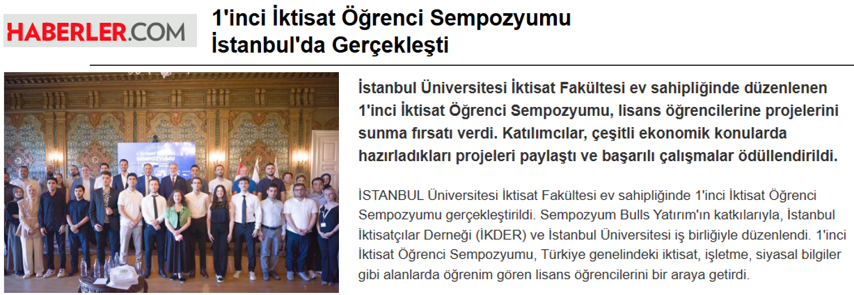 İSTANBUL Üniversitesi İktisat Fakültesi ev sahipliğinde 1'inci İktisat Öğrenci Sempozyumu gerçekleştirildi. Sempozyum Bulls Yatırım'ın katkılarıyla, İstanbul İktisatçılar Derneği (İKDER) ve İstanbul Üniversitesi iş birliğiyle düzenlendi. 1'inci İktisat Öğrenci Sempozyumu, Türkiye genelindeki iktisat, işletme, siyasal bilgiler gibi alanlarda öğrenim gören lisans öğrencilerini bir araya getirdi.