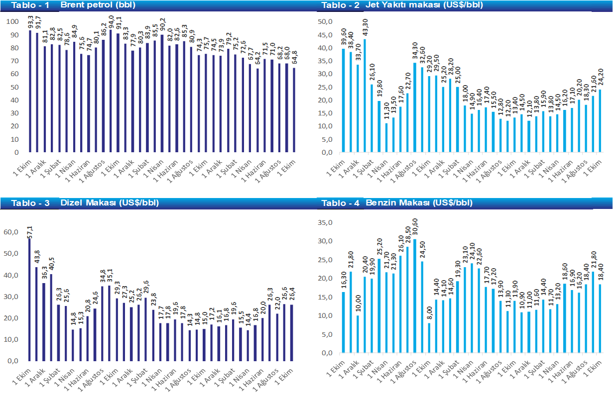 10A25 Eylül ortalamaları baz alındığında; motorin marjları yıllık bazda %4 ve jet yakıtı %1 artarken, benzin %9, fuel oil %47, LPG %25 ve Nafta %24 oranında geriledi.