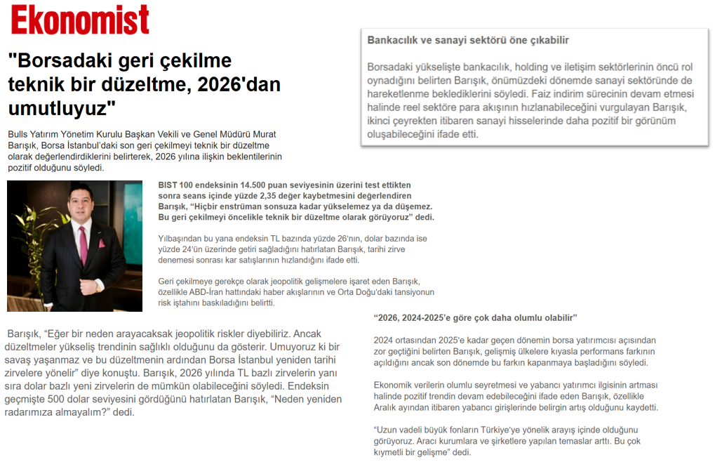 Bulls Yatırım Yönetim Kurulu Başkan Vekili ve Genel Müdürü Murat Barışık, Borsa İstanbul’daki son geri çekilmeyi teknik bir düzeltme olarak değerlendirdiklerini belirterek, 2026 yılına ilişkin beklentilerinin pozitif olduğunu söyledi.