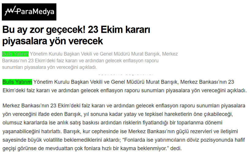 Bulls Yatırım Yönetim Kurulu Başkan Vekili ve Genel Müdürü Murat Barışık, Merkez Bankası’nın 23 Ekim’deki faiz kararı ve ardından gelecek enflasyon raporu sunumları piyasalara yön vereceğini açıkladı.