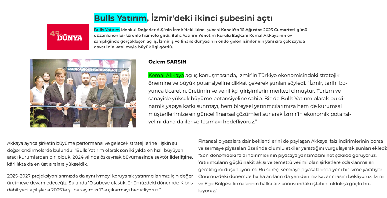 Bulls Yatırım Menkul Değerler A.Ş.’nin İzmir’deki ikinci şubesi Konak’ta 16 Ağustos 2025 Cumartesi günü düzenlenen bir törenle hizmete girdi. Bulls Yatırım Yönetim Kurulu Başkanı Kemal Akkaya’nın ev sahipliğinde gerçekleşen açılış, İzmir iş ve finans dünyasının önde gelen isimlerinin yanı sıra çok sayıda davetlinin katılımıyla büyük ilgi gördü.