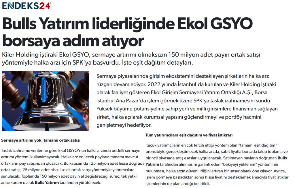 Kiler Holding iştiraki Ekol GSYO, sermaye artırımı olmaksızın 150 milyon adet payın ortak satışı yöntemiyle halka arzı için SPK´ya başvurdu.
