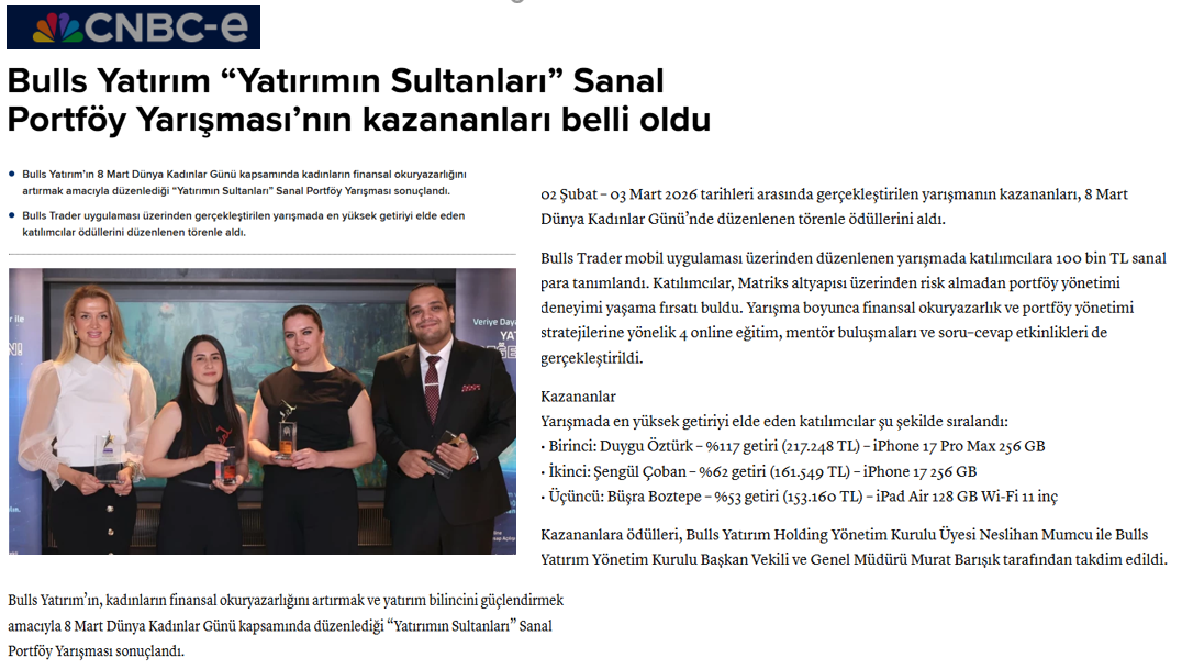 Bulls Yatırım’ın 8 Mart Dünya Kadınlar Günü kapsamında kadınların finansal okuryazarlığını artırmak amacıyla düzenlediği “Yatırımın Sultanları” Sanal Portföy Yarışması sonuçlandı.