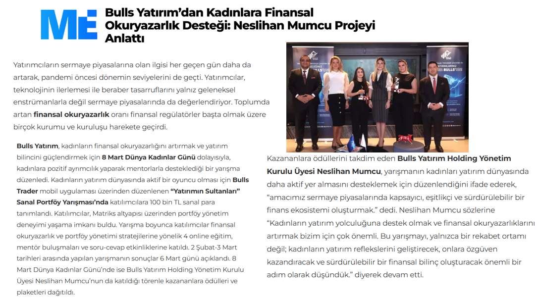 Bulls Yatırım, kadınların finansal okuryazarlığını artırmak ve yatırım bilincini güçlendirmek için 8 Mart Dünya Kadınlar Günü dolayısıyla, kadınlara pozitif ayrımcılık yaparak mentorlarla desteklediği bir yarışma düzenledi.