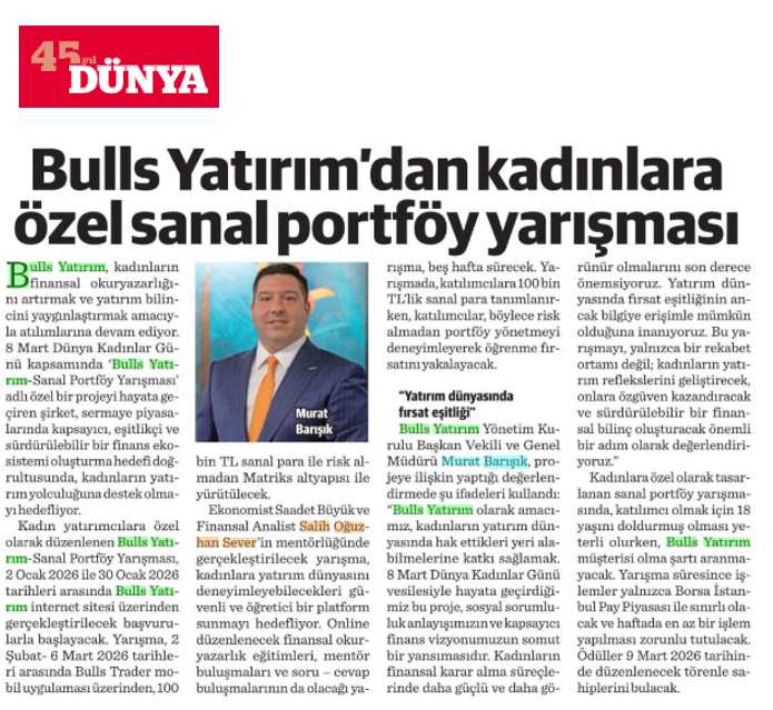 05.01.2026Bulls Yatırım´dan Kadınlara Özel Sanal Portföy Yarışması Bulls Yatırım, kadınların finansal okuryazarlığını artırmak ve yatırım bilincini yaygınlaştırmak adına atılımlarına devam ediyor. Şimdi Hesap Açın