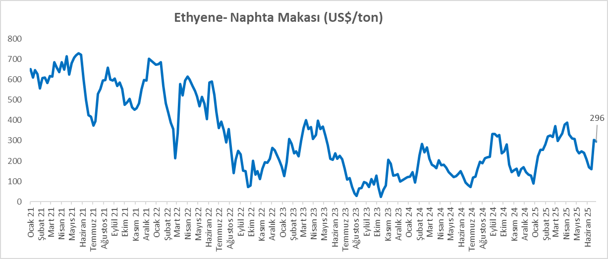 Etilen Nafta Makası 4 Temmuz itibariyle haftalık %2,5 azalışla 296 dolar seviyesine geriledi.