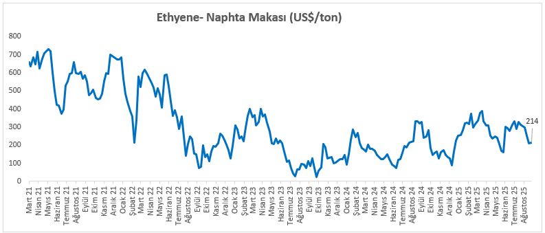 Etilen Nafta Makası 19 Eylül itibariyle haftalık %1,9 artışla 214 dolar seviyesine çıktı.