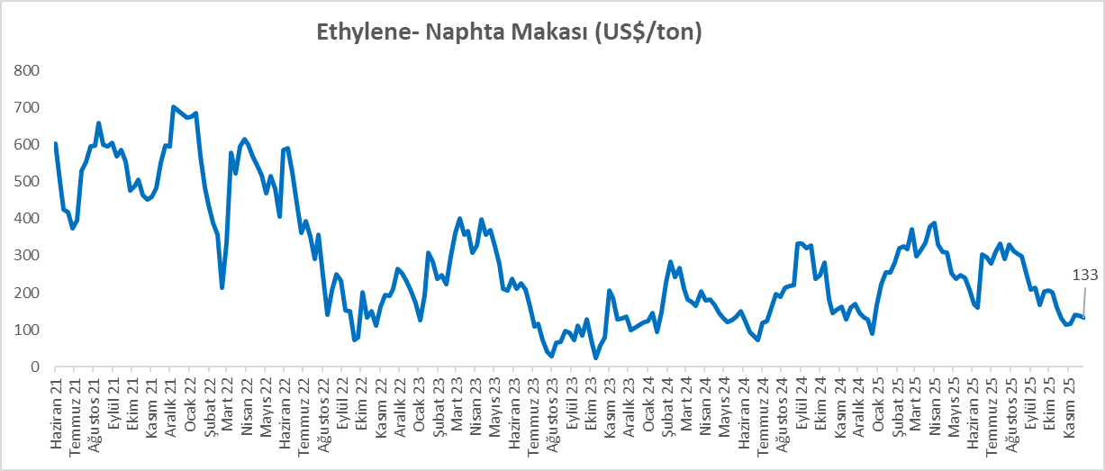 Etilen Nafta Makası 5 Aralık itibariyle haftalık %3,8 azalışla 133 dolar seviyesine düştü.