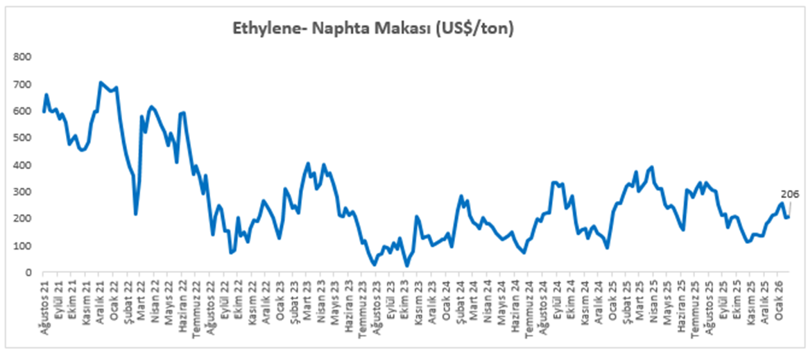 Etilen Nafta Makası 6 Şubat itibariyle haftalık %1,6 artışla 206 dolar seviyesine yükseldi.