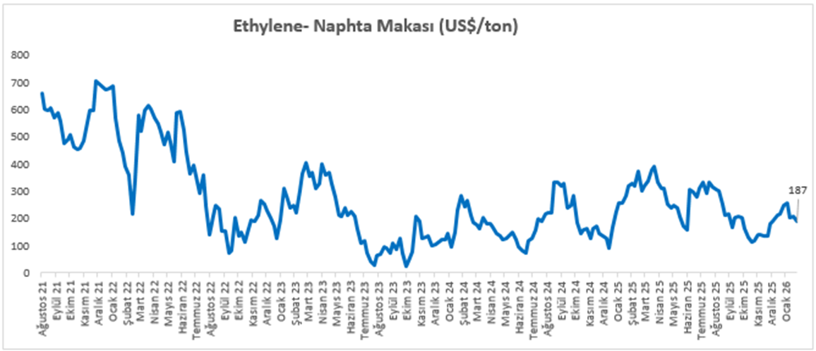 Etilen Nafta Makası 13 Şubat itibariyle haftalık %9,2 azalışla 187 dolar seviyesine düştü.