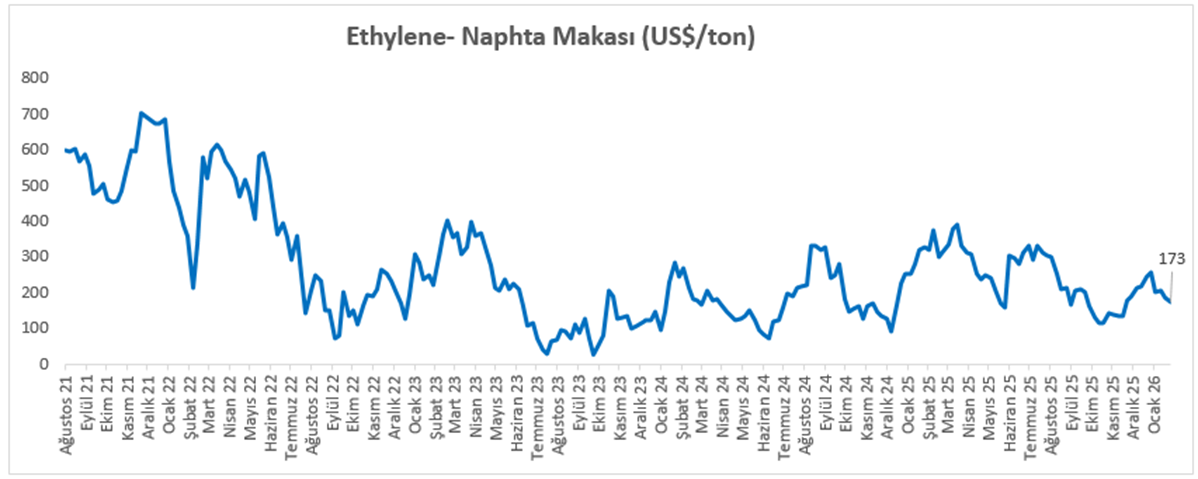Etilen Nafta Makası 20 Şubat itibariyle haftalık %7,8 azalışla 173 dolar seviyesine düştü.