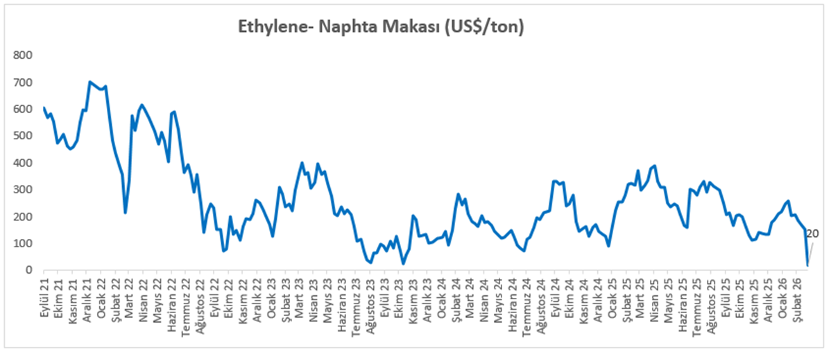 Etilen Nafta Makası 6 Mart itibariyle haftalık %87,7 azalışla 20 dolar seviyesine düştü.