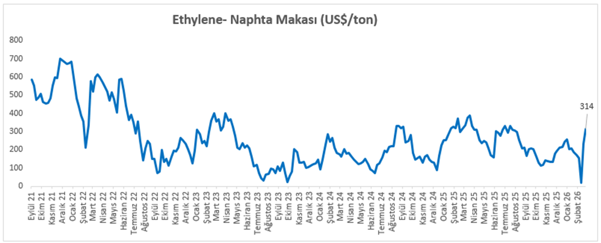 Etilen Nafta Makası 20 Mart itibarıyle haftalık 34,7 artışla 314 dolar seviyesine yükseldi.