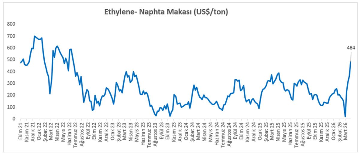 Etilen fiyatları haftalık bazda %13,0 artarken, nafta fiyatları ise %5,0 yükseldi.