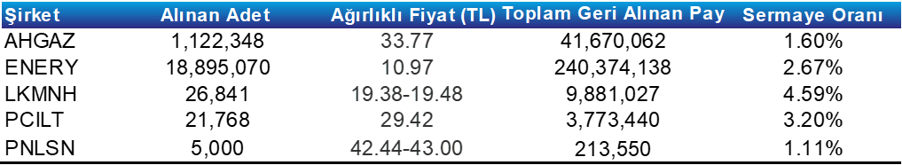 • Astor Enerji Astor Holding, şirkette sahip olduğu %9,02 paya denk gelen 90 mn adet B grubu payı, hisse başına 109 TL fiyatla (%8 iskonto) kurumsal yatırımcılara sattı. İşlemden 9,810 mn TL brüt hasılat elde edildi. Satış sonrası halka açıklık oranı %36,8’e yükselirken, Feridun Geçgel’in toplam payı %60,2 seviyesinde korunacak. (Kaynak: KAP)