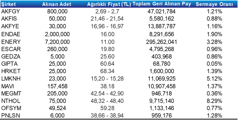 • Dagi Giyim Şirket, yönetim kurulu kararıyla pay geri alım programını güncellediğini, azami 35mn adet payın geri alınabileceğini ve program için toplam 300,0mn TL kaynak ayrıldığını bildirdi. (Kaynak: KAP)