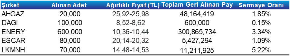 • Smart Güneş Enerjisi Şirket, Smart Holding’in Smart Güneş Enerjisi’nde sahip olduğu çıkarılmış sermayenin %9,57’sine denk gelen 58 mn adet B grubu payların 1 TL nominal değerli pay için 28,5 TL fiyat ile Tera Yatırım aracılığı ile Borsa İstanbul Toptan Satışlar Pazarı’nda 05.12.2025 tarihinde satılacağını açıkladı. (Kaynak: KAP)