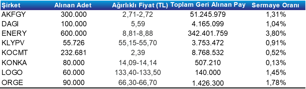 - Kalekim <KLKIM TI> 4Ç25 sonuçları … Şirket 4Ç25 döneminde beklentilerin %16 üzerinde yıllık bazda %21 azalışla 350 mn TL net kâr açıkladı. Beklentilerin üzerinde gerçekleşen operasyonel performans net kârdaki sapmanın ana nedeni oldu. İlgili dönemde net satışlar beklentilerin %5 üzerinde, yıllık %19 artarak 3.003 mn TL yükselmiştir. Şirketin FAVÖK’ü ise beklentilerin %28 üzerinde yıllık %60 artarak 799 mn TL olarak gerçeklemiştir. Şirketin 4Ç25 itibariyle 2.353 mn TL net nakit pozisyonundadır (3Ç25: 1.863 mn TL). (Kaynak: KAP)