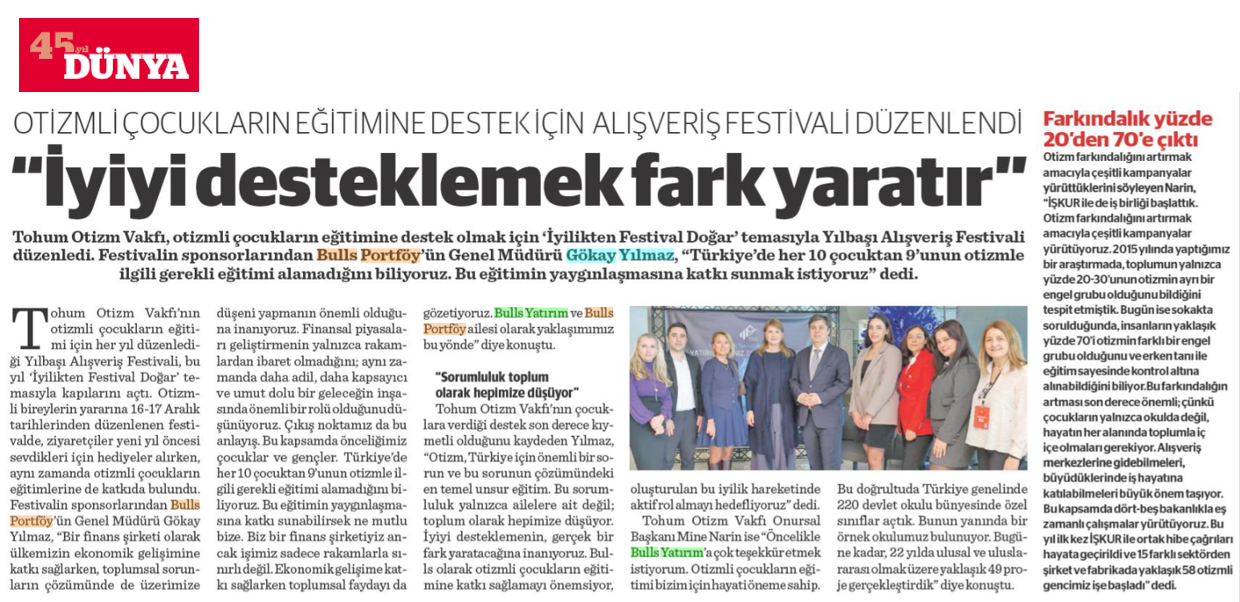 Otizmli çocukların eğitimine destek için düzenlenen alışveriş festivalinde Bulls Yatırım'da yer aldı.