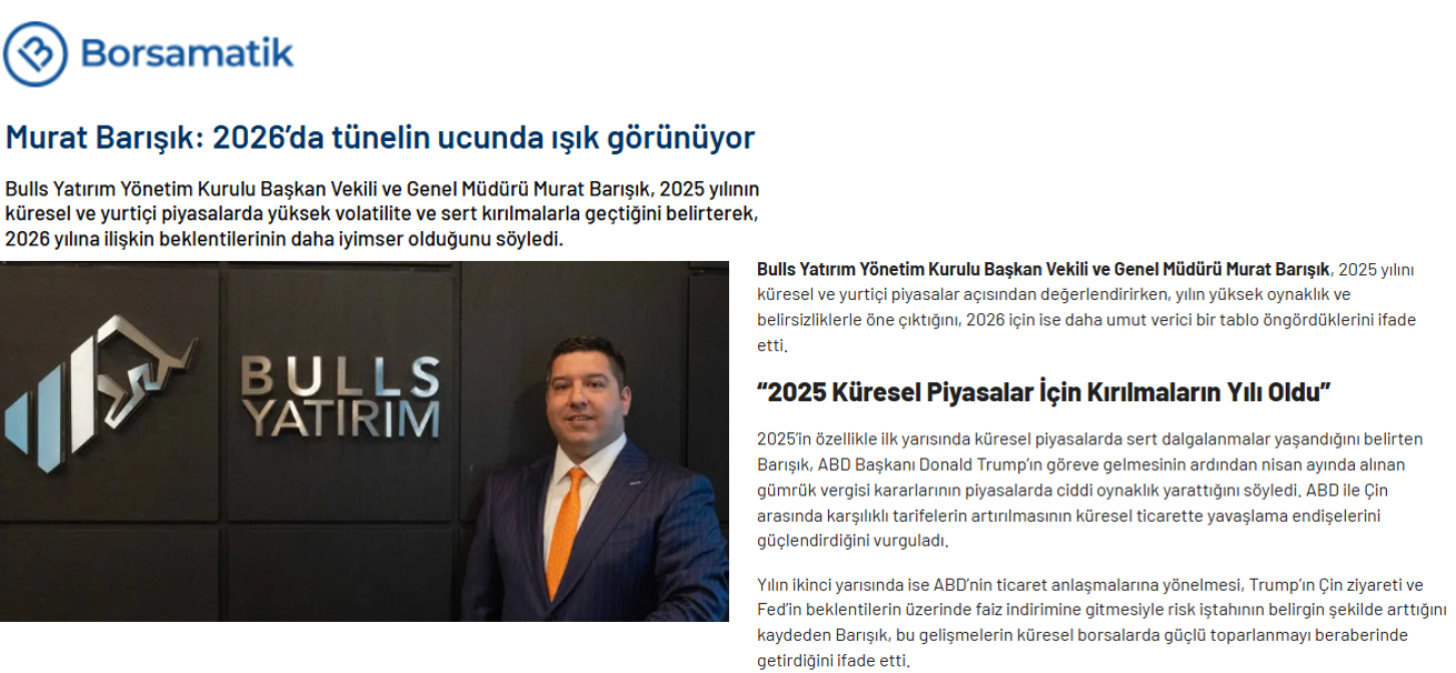 31.12.2025Murat Barışık: 2026’da tünelin ucunda ışık görünüyor BorsamatikHaberi okumak için tıklayın Şimdi Hesap Açın