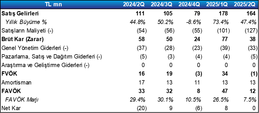 - Kârlılık: Şirket, 2Ç25’te 157 bin TL net kâr açıklamıştır. Geçtiğimiz yılın aynı döneminde ise 20mn TL net zarar açıklamıştı. Net kârdaki bu iyileşmenin ana nedeni, operasyonel performanstaki artıştan kaynaklanmaktadır. 2025 yılının ikinci çeyreğinde şirketin cirosu, yıllık bazda %47 artışla 164 mn TL seviyesine ulaşmıştır. FAVÖK ise 12 milyon TL olarak gerçekleşmiştir.