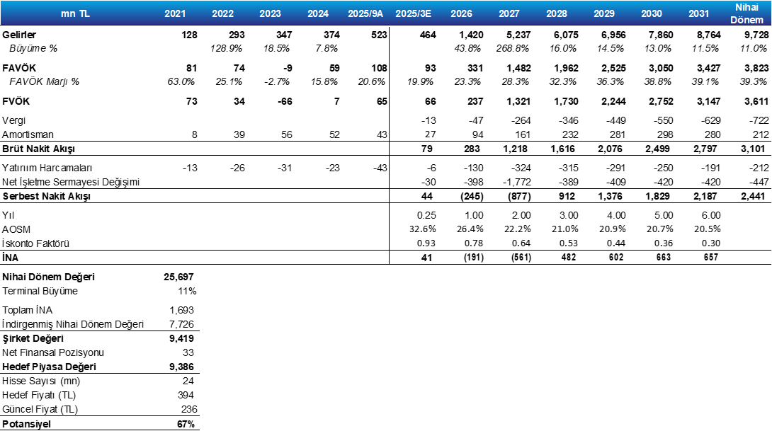 - Kârlılık açısından bakıldığında, son dönemde yapılan yatırımlar ve büyümenin etkisiyle şirketin daha sabit maliyet ağırlıklı bir yapıya geçtiği görülmektedir. Cirodaki artışla birlikte bu yapı, marjlarda anlamlı bir genişlemeyi mümkün kılmaktadır. 2025’in ilk dokuz ayında FAVÖK marjı yaklaşık %20 seviyesinde gerçekleşmiş olup, orta vadede şirketin kârlılığını artırarak FAVÖK marjlarını %40’lı seviyelere doğru taşımasını bekliyoruz.