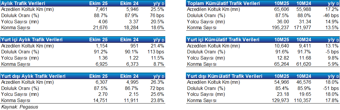 Toplam yolcu Ekim'25'te bir önceki yıla göre %20,5 artış gösterdi. Yurt içi yolcu sayısı Ekim 2025'te y/y %11,5 artış göstererek 1.36mn yolcu seviyesine ulaşırken, uluslararası yolcu sayısı Eylül 2025'te y/y %25,6 artarak 2,70mn yolcu seviyesine ulaştı.