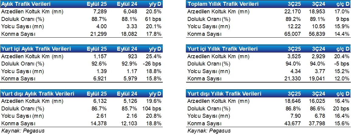 Toplam yolcu Eylül'25'te bir önceki yıla göre %20,1 artış gösterdi. Yurt içi yolcu sayısı Eylül 2025'te y/y %18,8 artış göstererek 1.39mn yolcu seviyesine ulaşırken, uluslararası yolcu sayısı Eylül 2025'te y/y %20.8 artarak 2,61mn yolcu seviyesine ulaştı.