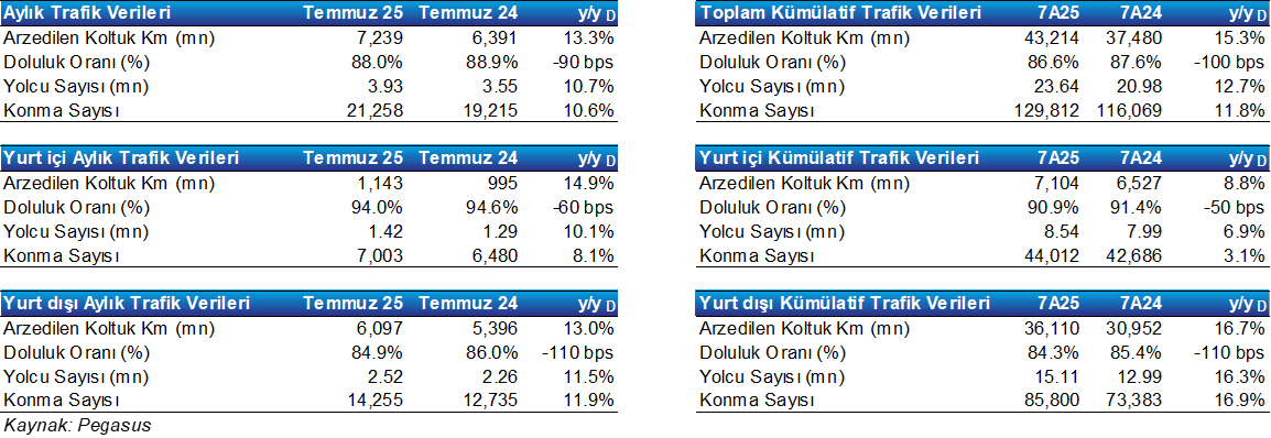 Toplam yolcu Temmuz'25'te bir önceki yıla göre %10,6 artış gösterdi. Yurt içi yolcu sayısı Temmuz 2025'de y/y %10,1 artış göstererek 1.42mn yolcu seviyesine ulaşırken, uluslararası yolcu sayısı Temmuz 2025'te y/y %11.5 artarak 2,52mn yolcu seviyesine ulaştı.