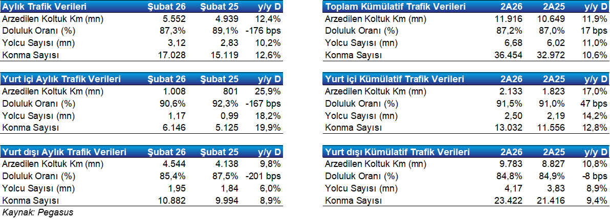Toplam yolcu Şubat'26'da bir önceki yıla göre %10,2 artış gösterdi. Yurt içi yolcu sayısı Şubat 2026'da y/y %18,2 artış göstererek 1.17 mn yolcu seviyesine ulaşırken, uluslararası yolcu sayısı Şubat 2026'da y/y %6,0 artarak 1,95 mn yolcu seviyesine ulaştı. Yolcu sayısındaki artış trendi kuvvetli seyrini sürdürmektedir.