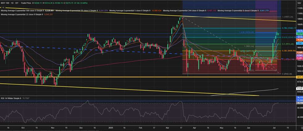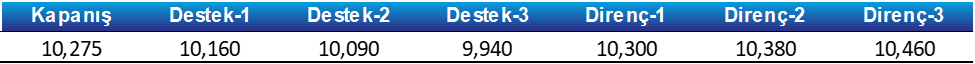 - Teknik açıdan, endeksin 10.300 seviyesinin üzerinde kalmakta zorlandığı ancak geri çekilmelerin de sınırlı kaldığı bir fiyatlama davranışı dikkat çekiyor. Kısa ve orta vadede yukarı yönlü hareketlerin devam edebilmesi için 10.300 direnç bölgesinin aşılması gerektiğini düşünüyoruz. Bu seviyenin geçilmesi durumunda alımların artabileceğini ve 10.380 - 10.460 direnç bölgesinin hedeflenebileceğini öngörüyoruz. Geri çekilmelerde ise kısa vadeli yön açısından takip ettiğimiz 5 günlük üssel hareketli ortalama seviyesi olan 10.090 puanı yakından izlenebilir.