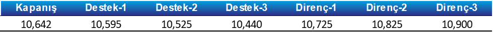 - Endekste gün içi geri çekilmelerde 10.595 - 10.525 - 10.440 puan seviyelerini takip edeceğiz. Yukarı hareketlerde ise sırasıyla 10.725 - 10.825 - 10.900 direnç seviyeleri olarak izlenebilir.