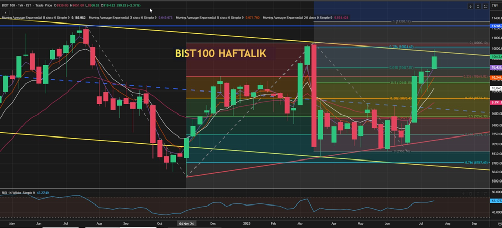 - BIST 100 endeksi, geçtiğimiz hafta 10.413 - 10.783 aralığında dalgalandıktan sonra haftayı %2,67’lik yükselişle 10.642 puandan tamamladı. Endekste 9.200 puandan başlayan yükseliş hareketinde beklenti yönetimi açısından iki majör gelişme takip ediliyordu. Bu beklentilerin ikisi de cuma akşamı itibarıyla tamamlanmış oldu. Moody’s’ten gelen not artırımıyla birlikte, Türkiye’nin kredi notu diğer derecelendirme kuruluşlarının seviyesine çekilmiş oldu.