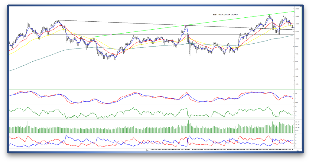 - Teknik açıdan bakıldığında, güçlenme hareketinin başlayabilmesi için 5 günlük üssel hareketli ortalamanın (bugün için 10.850) üzerine yerleşilmesi önem taşıyor. Bu seviyenin aşılması halinde psikolojik direnç olarak izlenen 11.000 seviyesi test edilebilir. 11.000 üzerinde kalıcılık sağlanması durumunda ise geçmişte yatay direnç olarak çalışmış olan 11.290 seviyeleri hedeflenebilir.
