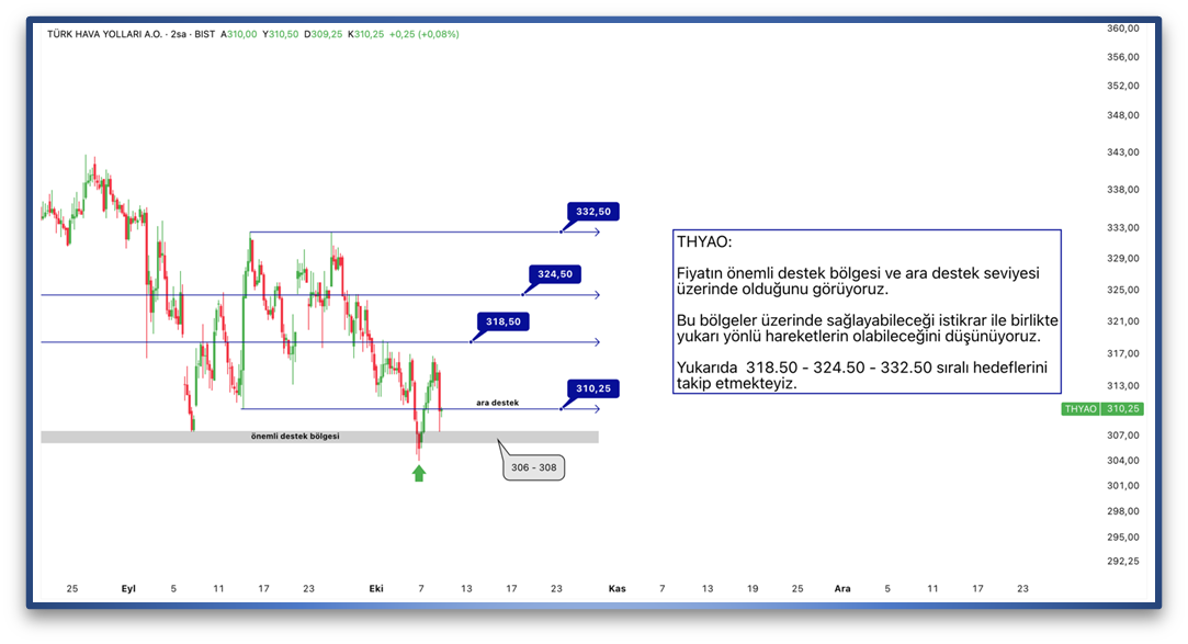 Fiyatın önemli destek bölgesi ve ara destek seviyesi üzerinde olduğunu görüyoruz. Bu bölgeler üzerinde sağlayabileceği istikrar ile birlikte yukarı yönlü hareketlerin olabileceğini düşünüyoruz. Yukarıda 318.50 - 324.50 - 332.50 sıralı hedeflerini takip etmekteyiz.