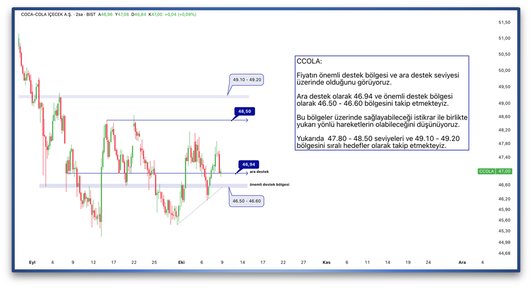 Fiyatın önemli destek bölgesi ve ara destek seviyesi üzerinde olduğunu görüyoruz. Ara destek olarak 46.94 ve önemli destek bölgesi olarak 46.50 - 46.60 bölgesini takip etmekteyiz. Bu bölgeler üzerinde sağlayabileceği istikrar ile birlikte yukarı yönlü hareketlerin olabileceğini düşünüyoruz. Yukarıda 47.80 - 48.50 seviyeleri ve 49.10 - 49.20 bölgesini sıralı hedefler olarak takip etmekteyiz.