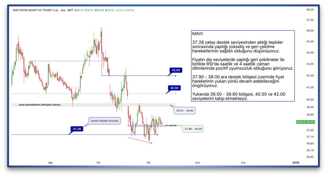 37.28 yatay destek seviyesinden aldığı tepkiler sonrasında yaptığı yükseliş ve geri çekilme hareketlerinin sağlıklı olduğunu düşünüyoruz. Fiyatın dip seviyelerde yaptığı geri çekilmeler ile birlikte RSI'da saatlik ve 4 saatlik zaman dilimlerinde pozitif uyumsuzluk olduğunu görüyoruz. 37.90 - 38.00 ara destek bölgesi üzerinde fiyat hareketinin yukarı yönlü devam edebileceğini öngörüyoruz. Yukarıda 39.50 - 39.60 bölgesi, 40.50 ve 42.00 seviyelerini takip etmekteyiz.