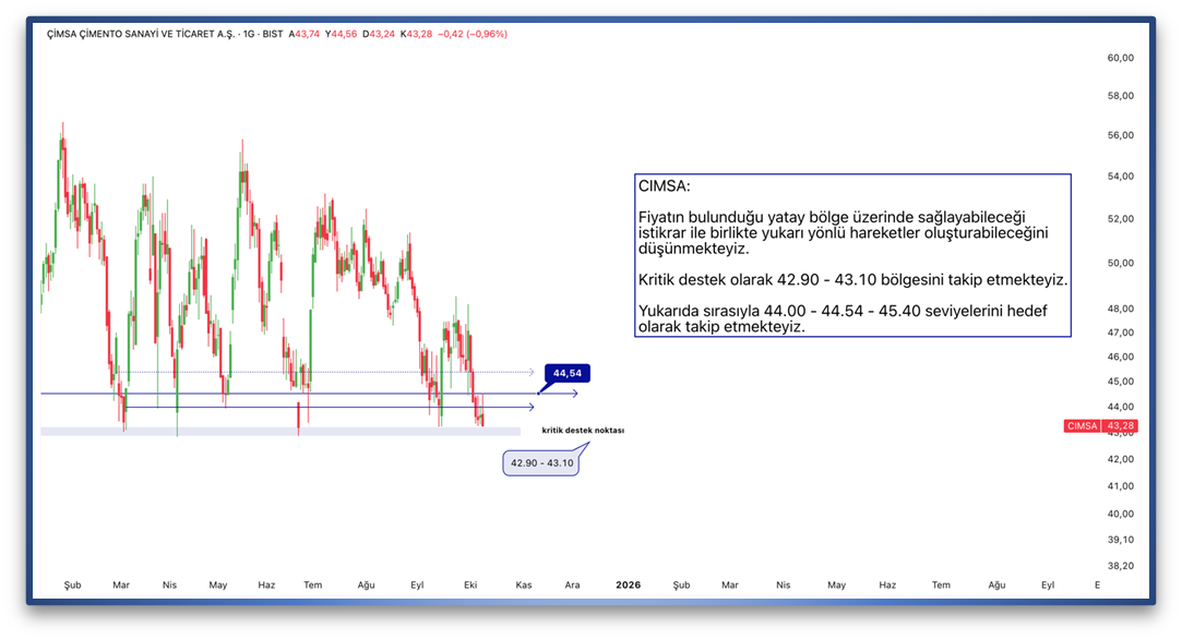 Fiyatın bulunduğu yatay bölge üzerinde sağlayabileceği istikrar ile birlikte yukarı yönlü hareketler oluşturabileceğini düşünmekteyiz. Kritik destek olarak 42.90 - 43.10 bölgesini takip etmekteyiz. Yukarıda sırasıyla 44.00 - 44.54 - 45.40 seviyelerini hedef olarak takip etmekteyiz.