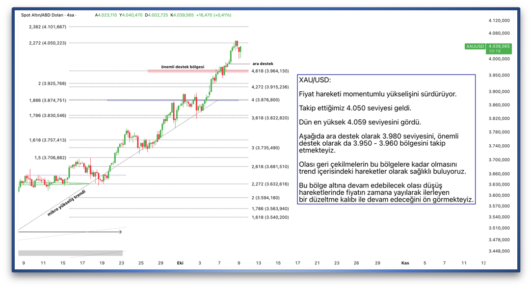 Fiyat hareketi momentumlu yükselişini sürdürüyor. Takip ettiğimiz 4.050 seviyesi geldi. Dün en yüksek 4.059 seviyesini gördü. Aşağıda ara destek olarak 3.980 seviyesini, önemli destek olarak da 3.950 - 3.960 bölgesini takip etmekteyiz. Olası geri çekilmelerin bu bölgelere kadar olmasını trend içerisindeki hareketler olarak sağlıklı buluyoruz. Bu bölge altına devam edebilecek olası düşüş hareketlerinde fiyatın zamana yayılarak ilerleyen bir düzeltme kalıbı ile devam edeceğini ön görmekteyiz.