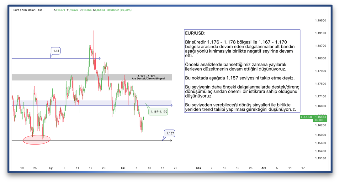 Bir süredir 1.176 - 1.178 bölgesi ile 1.167 - 1.170 bölgesi arasında devam eden dalgalanmalar alt bandın aşağı yönlü kırılmasıyla birlikte negatif seyirine devam etti. Önceki analizlerde bahsettiğimiz zamana yayılarak ilerleyen düzeltmenin devam ettiğini düşünüyoruz. Bu noktada aşağıda 1.157 seviyesini takip etmekteyiz. Bu seviyenin daha önceki dalgalanmalarda destek/direnç dönüşümü açısından önemli bir istikrara sahip olduğunu düşünüyoruz. Bu seviyeden verebileceği dönüş sinyalleri ile birlikte yeniden trend takibi yapılması gerektiğini düşünüyoruz.