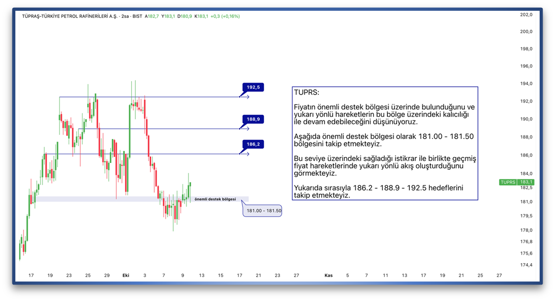 Fiyatın önemli destek bölgesi üzerinde bulunduğunu ve yukarı yönlü hareketlerin bu bölge üzerindeki kalıcılığı ile devam edebileceğini düşünüyoruz. Aşağıda önemli destek bölgesi olarak 181.00 - 181.50 bölgesini takip etmekteyiz. Bu seviye üzerindeki sağladığı istikrar ile birlikte geçmiş fiyat hareketlerinde yukarı yönlü akış oluşturduğunu görmekteyiz. Yukarıda sırasıyla 186.2 - 188.9 - 192.5 hedeflerini takip etmekteyiz.