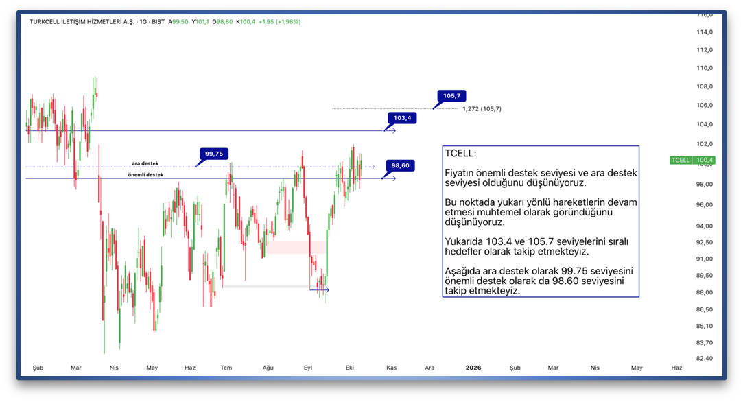Fiyatın önemli destek seviyesi ve ara destek seviyesi olduğunu düşünüyoruz. Bu noktada yukarı yönlü hareketlerin devam etmesi muhtemel olarak göründüğünü düşünüyoruz. Yukarıda 103.4 ve 105.7 seviyelerini sıralı hedefler olarak takip etmekteyiz. Aşağıda ara destek olarak 99.75 seviyesini önemli destek olarak da 98.60 seviyesini takip etmekteyiz.