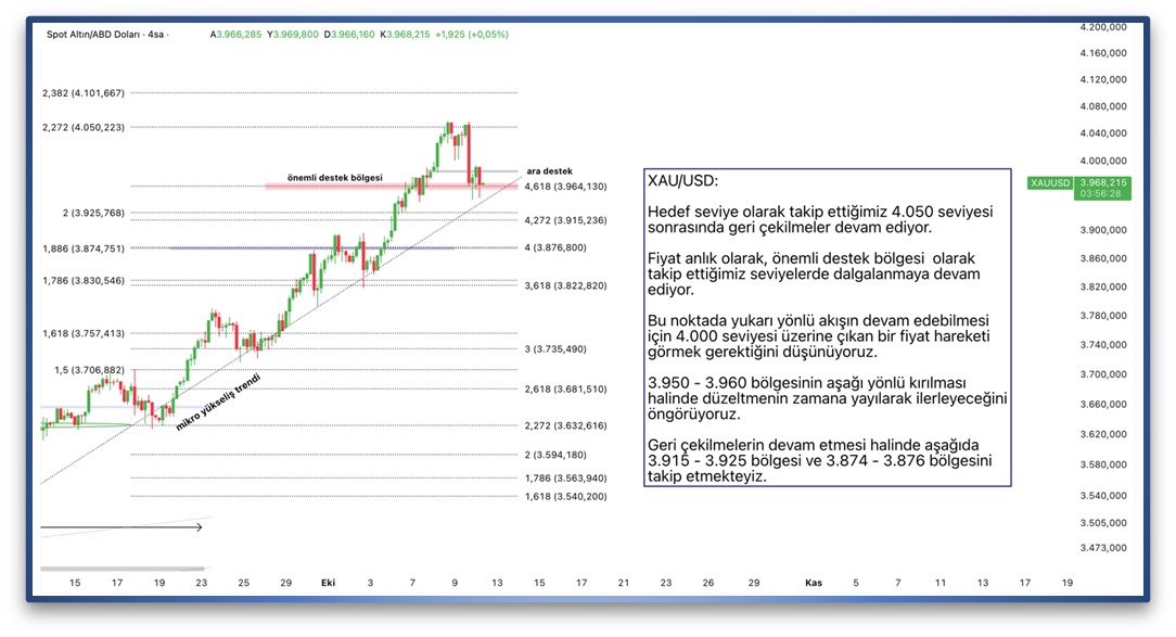 Hedef seviye olarak takip ettiğimiz 4.050 seviyesi sonrasında geri çekilmeler devam ediyor. Fiyat anlık olarak, önemli destek bölgesi olarak takip ettiğimiz seviyelerde dalgalanmaya devam ediyor. Bu noktada yukarı yönlü akışın devam edebilmesi için 4.000 seviyesi üzerine çıkan bir fiyat hareketi görmek gerektiğini düşünüyoruz. 3.950 - 3.960 bölgesinin aşağı yönlü kırılması halinde düzeltmenin zamana yayılarak ilerleyeceğini öngörüyoruz. Geri çekilmelerin devam etmesi halinde aşağıda 3.915 - 3.925 bölgesi ve 3.874 - 3.876 bölgesini takip etmekteyiz.