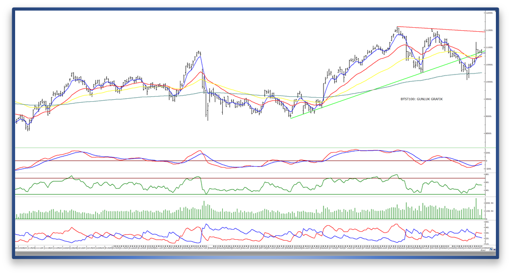 - Teknik açıdan, yukarı yönlü eğilimin güç kazanabilmesi için endeksin 11.000 puan seviyesinin üzerinde kalıcılık sağlaması gerektiğini düşünüyoruz. Bu seviyenin aşılması halinde 11.290 ve 11.460 seviyeleri sırasıyla direnç noktaları olarak takip edilecektir.
