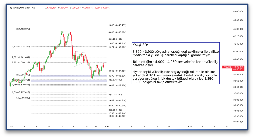 3.850 - 3.900 bölgesine yaptığı geri çekilmeler ile birlikte fiyatın tepki yükselişi hareketi yaptığını görmekteyiz. Takip ettiğimiz 4.000 - 4.050 seviyelerine kadar yükseliş hareketi geldi. Fiyatın tepki yükselişinde sağlayacağı istikrar ile birlikte yukarıda 4.101 seviyesini sıradaki hedef olarak, bununla beraber aşağıda kritik destek bölgesi olarak ise 3.850 - 3.900 bölgesini takip etmekteyiz.