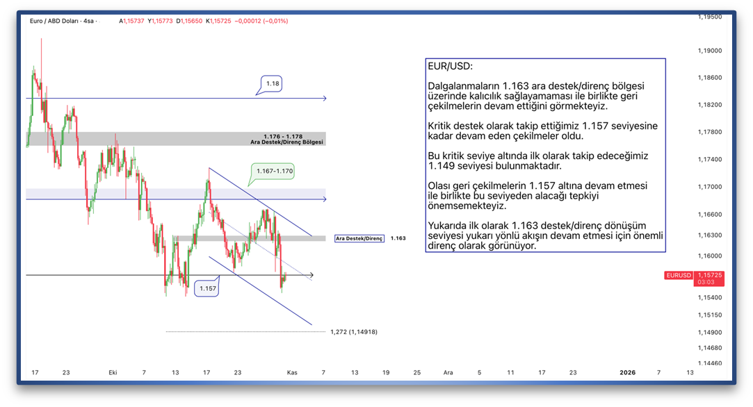 Dalgalanmaların 1.163 ara destek/direnç bölgesi üzerinde kalıcılık sağlayamaması ile birlikte geri çekilmelerin devam ettiğini görmekteyiz. Kritik destek olarak takip ettiğimiz 1.157 seviyesine kadar devam eden çekilmeler oldu. Bu kritik seviye altında ilk olarak takip edeceğimiz 1.149 seviyesi bulunmaktadır. Olası geri çekilmelerin 1.157 altına devam etmesi ile birlikte bu seviyeden alacağı tepkiyi önemsemekteyiz. Yukarıda ilk olarak 1.163 destek/direnç dönüşüm seviyesi yukarı yönlü akışın devam etmesi için önemli direnç olarak görünüyor.