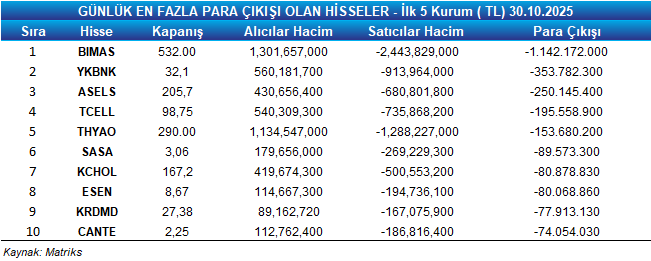 - Para çıkışı, ilk 5 kurumun alış ve satış hacimlerinin toplamıyla belirlenir.