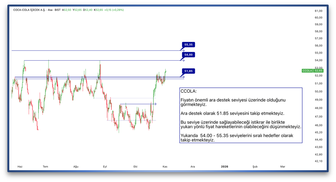 Fiyatın önemli ara destek seviyesi üzerinde olduğunu görmekteyiz. Ara destek olarak 51.85 seviyesini takip etmekteyiz. Bu seviye üzerinde sağlayabileceği istikrar ile birlikte yukarı yönlü fiyat hareketlerinin olabileceğini düşünmekteyiz. Yukarıda 54.00 - 55.35 seviyelerini sıralı hedefler olarak takip etmekteyiz.