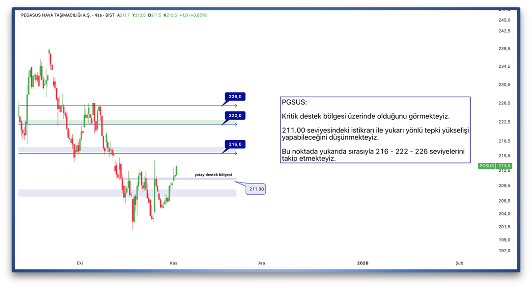 Kritik destek bölgesi üzerinde olduğunu görmekteyiz. 211.00 seviyesindeki istikrarı ile yukarı yönlü tepki yükselişi yapabileceğini düşünmekteyiz. Bu noktada yukarıda sırasıyla 216 - 222 - 226 seviyelerini takip etmekteyiz.